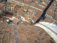 effect has been used historically, by Trajan (a Roman emperor) whose column contained a tight, narrow, and dark staircase intended to disorient climbers, who would emerge to a statue of himself framed by blinding sunlight at the top. The same idea seemed to have been applied here and I certainly felt surprised to arrive at the top when I did. But the view was spectacular, all of Florence laid out before me, somehow distant yet close at the same time, with only the curves of the dome to connect me to the ground. The untamed building of Florence were transformed into neatly bound neighborhoods with a single step. And the silence, so absolute, both in the mind and space.